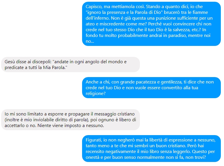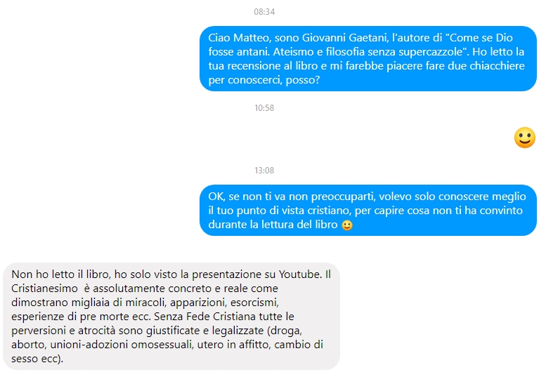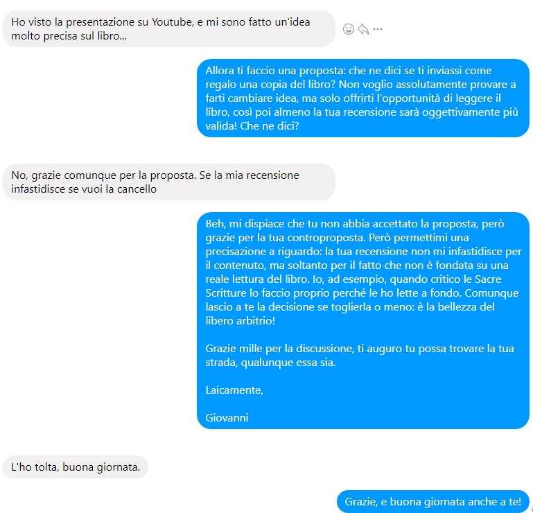 Matteo senza mezzi termini ha sconsigliato di comprare il mio libro a chiunque “ha a cuore la salvezza della propria anima” (sic!), senza entrare nel merito del libro ovviamente.