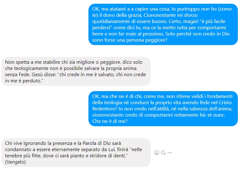 Io, da ateo e da umanista, ho provato a ascoltare le sue ragioni; Matteo, da cristiano e da cattolico, ha fatto invece un po’ lo slalom tra le mie domande, come il 95% dei credenti come lui.