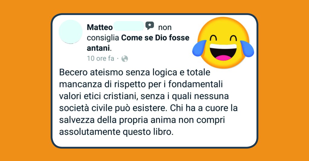L’anno scorso ho pubblicato “Come se Dio fosse antani”, un libro che parla di filosofia e ateismo senza supercazzole. Ieri sulla pagina Facebook del libro un ragazzo di nome Matteo ha pubblicato una recensione in stile Santa Inquisizione. Ho deciso di scrivergli in privato per fare quattro chiacchiere, ecco cosa ne è venuto fuori.