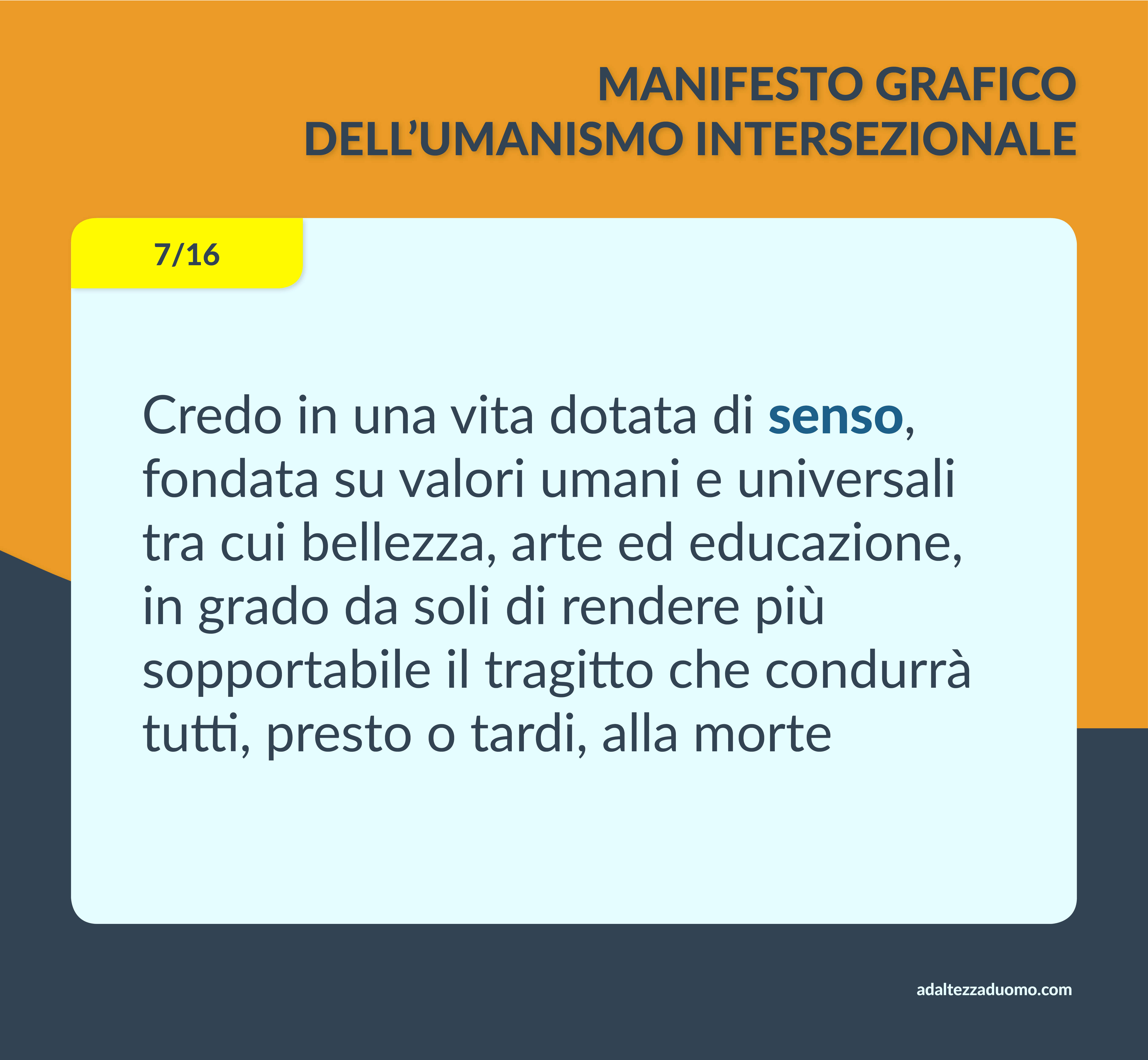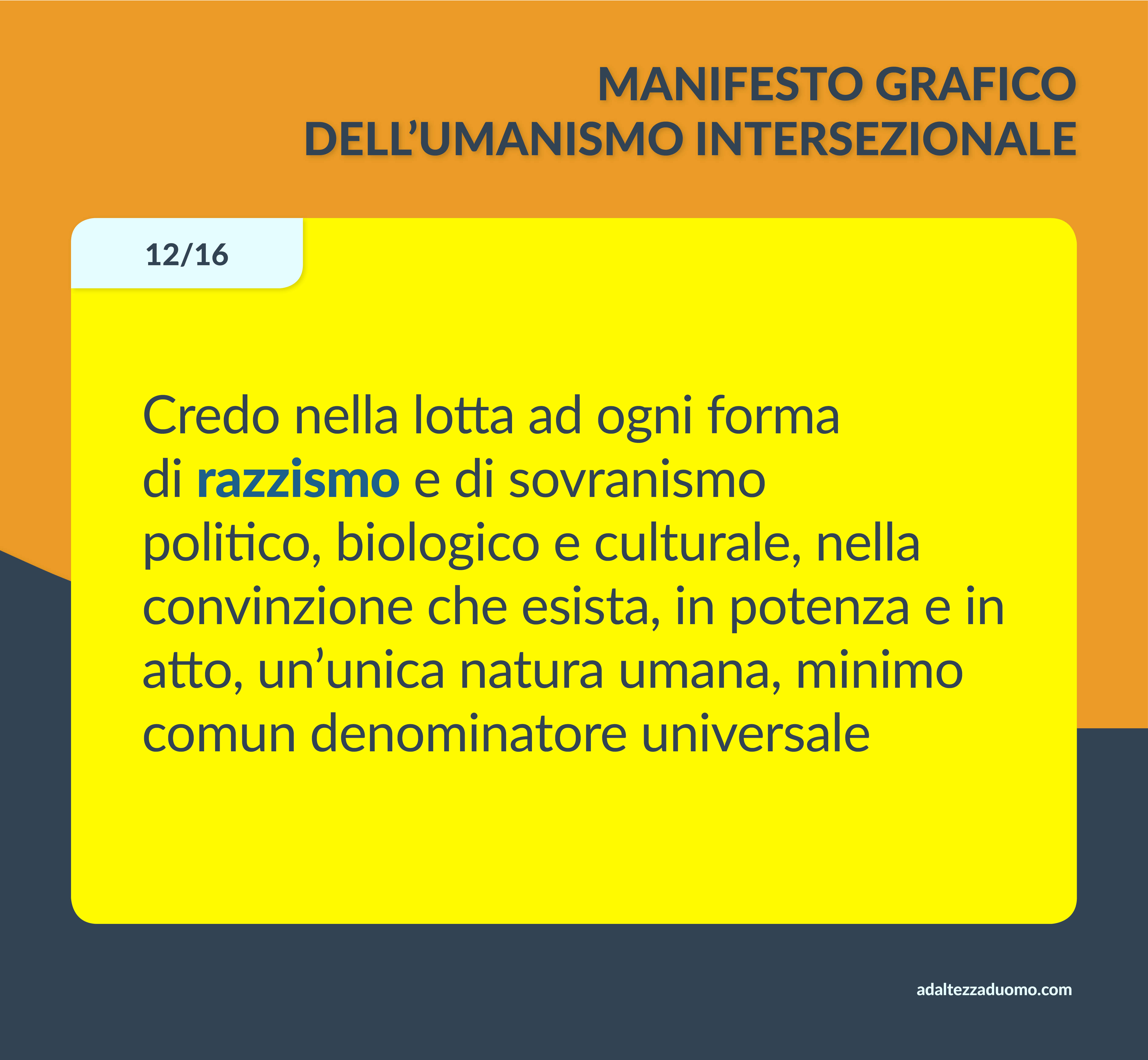 Questo è il Manifesto Grafico dell’Umanismo Intersezionale. Ne riassume in grafica i valori morali e le lotte politiche. Ognuno può sottoscriverlo o condividerlo secondo coscienza, senza bisogno di intermediari o cerimonie di alcun tipo.